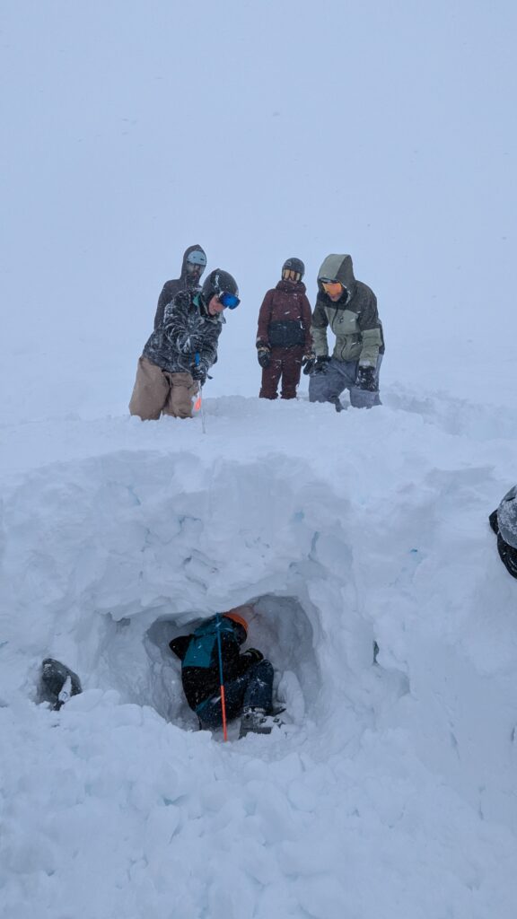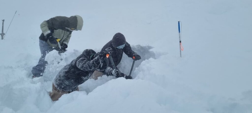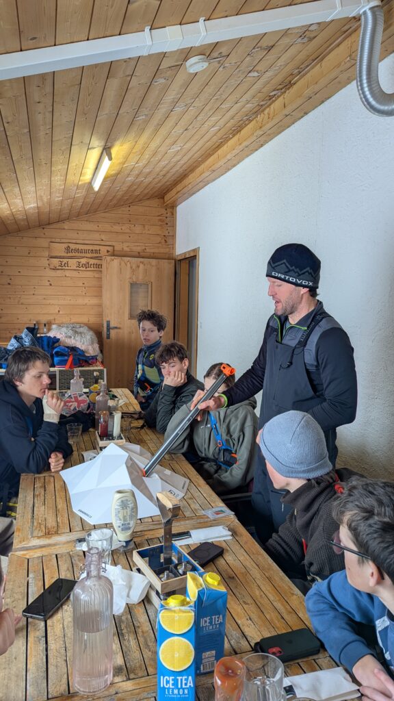 Trotz – oder gerade wegen – des enormen Neuschnees wurden während verschiedener Freeride-Abfahrten wichtige Geländemerkmale wie Hangsteilheit und Windzeichen analysiert. Nach einer stärkenden Mittagspause im Restaurant Stätz Damiez verlagerte sich der Fokus am Nachmittag auf den Ernstfall (Lawinenverschüttetensuche). Die Schüler:innen lernten den Umgang mit dem Lawinenverschüttetensuchgerät (LVS), das Sondieren und das richtige Schaufeln. Ein besonderes Highlight war die Möglichkeit, teilweise in einem echten Lawinenkegel zu üben, was den Jugendlichen das Ausmass der Naturgewalt eindrücklich vor Augen führte.